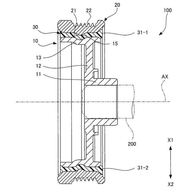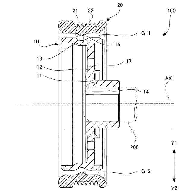図1は、第1実施形態に係るトーショナルダンパー100の平面図である。図2は、図1中のA-A線断面図である。図3は、図1中のB-B線断面図である。トーショナルダンパー100は、レシプロエンジン等の内燃機関に設けられるクランクシャフト等のシャフト200に発生する振動を低減する動吸振器である。シャフト200は、中心軸AXまわりに回転する。シャフト200には、中心軸AXまわりの捩り振動および曲げ振動が発生し得る。なお、図1から図3では、シャフト200が二点鎖線で簡略的に図示される。