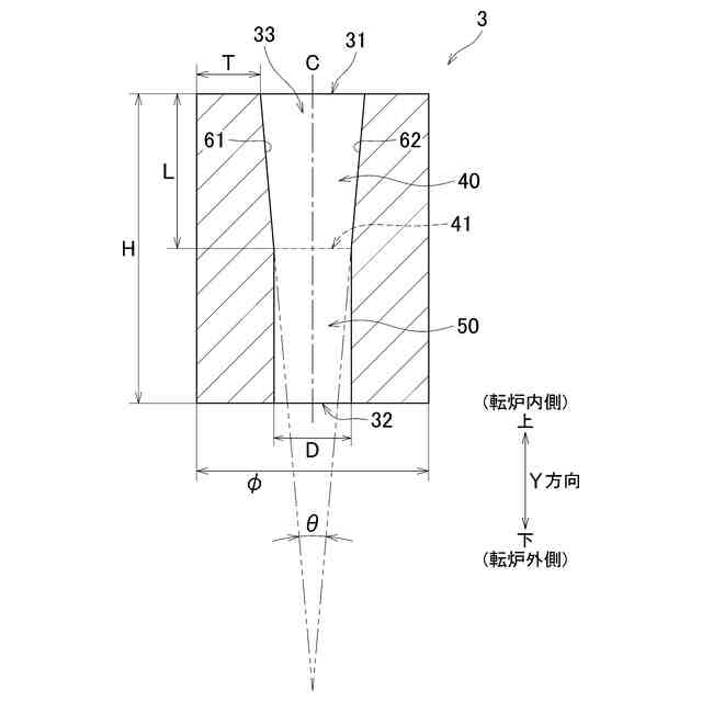 前記内孔は、精錬容器内の金属溶湯が入る入口と、前記精錬容器の外側に面した出口と、前記入口から前記出口に向かって径が連続的に小さくなるテーパー部とを有し、