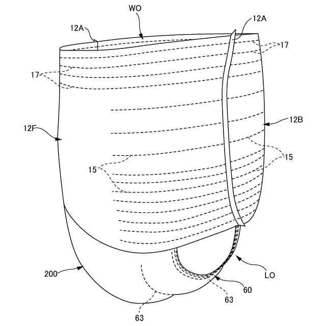前身頃の両側部と、後身頃の両側部とが接合されて形成された、環状の胴周り領域と、前記前身頃の胴周り領域から股間部を経て前記後身頃の胴周り領域にわたる中間領域と、前記胴周り領域における前記中間領域と反対側に設けられたウエスト開口と、前記中間領域の幅方向の両側に設けられた脚開口とを有し、