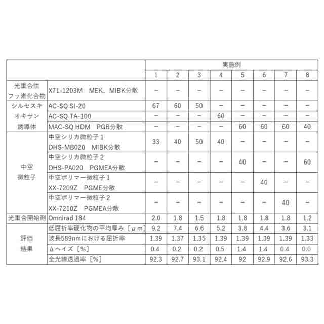 一方、これまでに、シルセスキオキサン化合物を含む熱硬化性系膜や焼成体が報告される(例えば、特開2022-132285号公報、特開2011-173738号公報など)。しかしながら、これらの従来技術はいずれも熱硬化型の樹脂組成物及び硬化物であり、熱履歴が大きく、硬化プロセスに煩雑な工程や時間がかかるという問題がある。一方、光硬化性の本実施形態の低屈折率樹脂組成物では、従来技術のゾルゲル反応による熱硬化型の樹脂組成物と比較して、熱履歴が小さく、かつ瞬間的に硬化物が製造できるため、生産プロセスが容易となる。