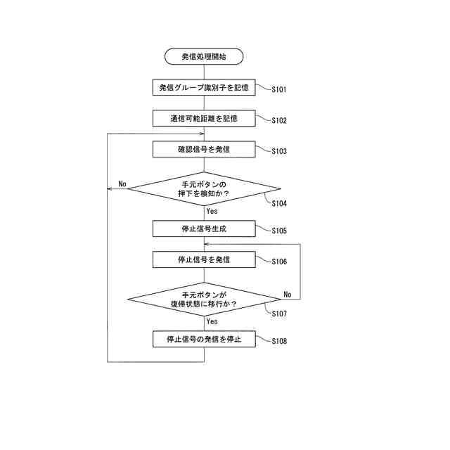 前記操作受付部の前記押下状態の維持を解除する前記復帰操作を検知すると、前記復帰操作を示す信号に前記発信グループ識別子を付与した復帰信号を前記通信範囲に発信する構成であり、