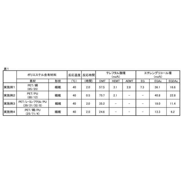 ポリエステルを解重合する方法として、水や、超臨界アルコールを用いる方法が知られている(特許文献1及び2参照)。しかし、いずれも300℃以上の高温条件を必要とする。一方、塩基触媒とアルコールを用いるエステル交換法では、比較的低温で解重合を達成できる。メタノールを用いる方法では、ハロゲン化溶媒を使用し、炭酸カリウム(非特許文献1参照)やアルカリ金属アルコキシド(特許文献3参照)を用いることで、室温~50℃程度の低温で解重合を達成できる。また、炭酸ジメチルをエチレングリコール捕捉剤とすることで、解重合を効率化する方法が知られている(非特許文献2)。しかし、これらの方法での解重合の対象物は、PETボトル等由来の高純度PETに限られており、それら以外のポリエステル含有材料は、これらの方法では適用されていない。着色したポリエステル繊維の解重合方法として、塩基触媒とエチレングリコールを過剰に用いる方法が知られているが、200℃程度の高温を必要とするほか、高純度のモノマーを得るために、高沸点溶媒による繊維の脱色処理(特許文献4~6参照)や、酸化剤による染料の分解(特許文献7参照)が必要であった。