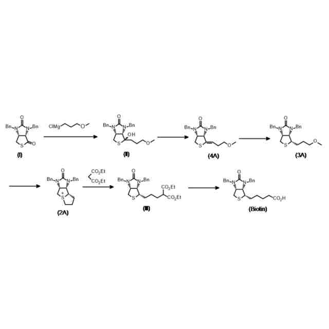 すなわち、先ず、前記式(I)で示される(3aS,6aR)-1,3-ジベンジルテトラヒドロ-1H-チエノ[3,4-d]イミダゾール-2,4-ジオン(以下、単に「チオラクトン誘導体」とする場合もある)と3-メトキシプロピルマグネシウムクロリド(以下、単に「グリニャール試薬」とする場合もある)とを反応させることで、前記式(II)に示すヒドロキシビオチン誘導体を合成し、これを脱水することで前記式(4A)に示すビニルビオチン誘導体を合成する。次いで当該ビニルビオチン誘導体をパラジウムやラネーニッケル触媒を用いた水素化反応に付することで前記式(3A)に示すビオチン誘導体を合成する。その後、ビオチン誘導体を酸性条件下、環化させることで前記式(2A)に示すチオファニウム塩誘導体を合成する。最後に、当該チオファニウム塩誘導体をマロン酸エステルとのカップリング及び脱保護の各工程を経てビオチンを製造する。なお、式中の「Bn」はベンジル基、「Et」はエチル基をそれぞれ表す。前記式(2A)に示すチオファニウム塩誘導体は対イオンとともに塩を形成して安定に存在しており、その対イオンとしては塩化物イオン、臭化物イオン、10-カンファースルホン酸イオンなどが報告されている(特許文献2参照)。中でもビオチンの製造においては対イオンが臭化物イオンとなっているものが汎用されている。