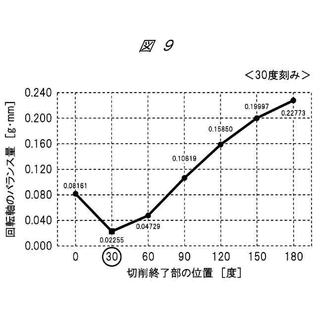 切削終了部の位置と回転軸のバランス量との関係を30度刻みで示したグラフである。