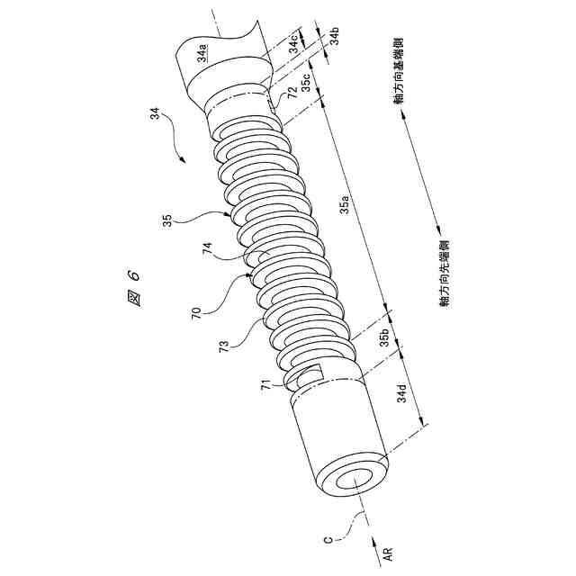 前記第1テーパ部,前記本体部および前記第2テーパ部の外周部に螺旋状に設けられ、歯先部および歯底部を備えた螺旋状歯と、
