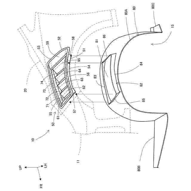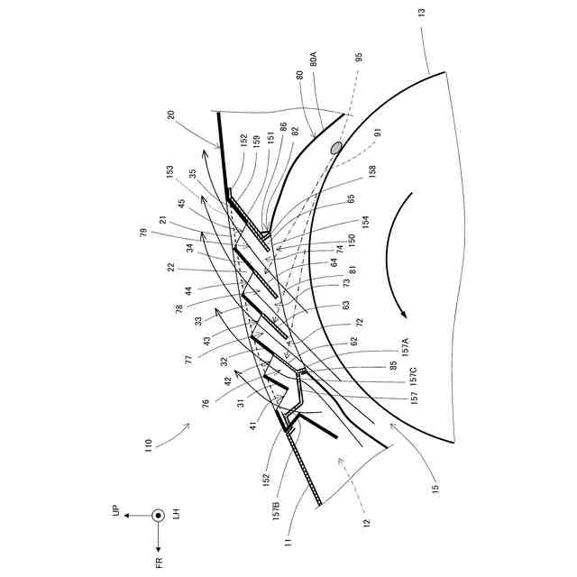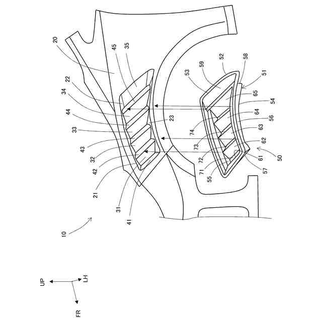 前記フェンダの前記外開口の後部に配置された複数の前記フェンダ羽板と複数の前記ダクト羽板とは、各前記フェンダ羽板の前記第1表面と各前記ダクト羽板の前記第2表面とが流れ方向に連なるように配置されており、