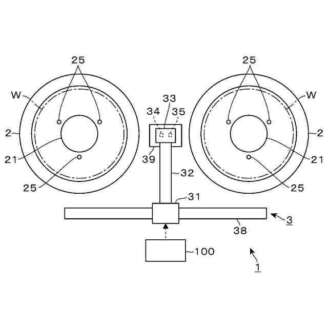 本開示の液処理装置の一実施形態である液処理装置1について、図1の平面図を参照して説明する。この液処理装置1は、ウエハWの表面の中心部に塗布液としてレジストをレジスト用のノズルから吐出し、ウエハWの回転によって当該レジストを広げて当該表面全体にレジスト膜を形成する。