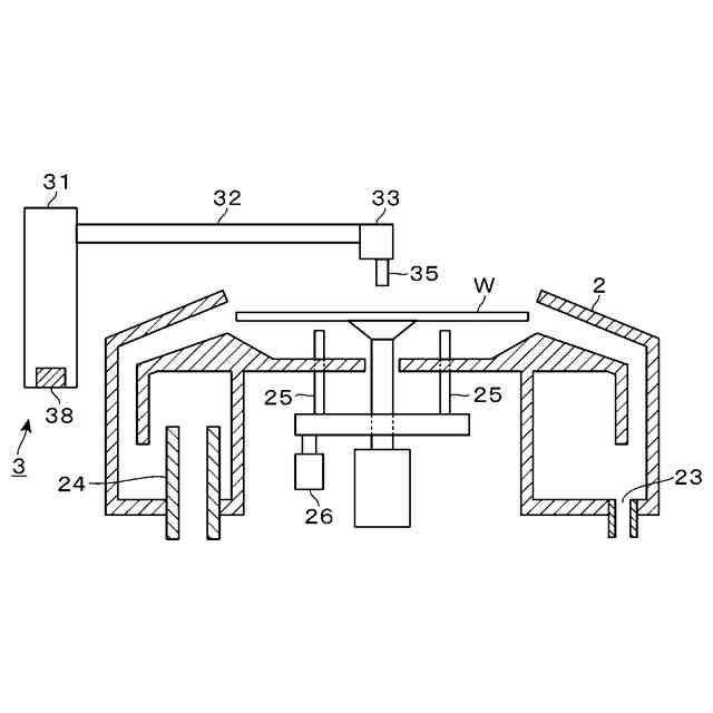また、液処理装置1では上記のウエハWへのレジストの吐出を行う前に、ウエハWの表面の中心部に、有機溶剤であるシンナーをシンナー用のノズルから吐出する。このシンナーについても、ウエハWの回転によってウエハWの表面全体に広げられる。このシンナーは、レジストの濡れ性が高まるようにウエハWの表面を改質する、いわゆるプリウエットと呼ばれる処理を行うための処理液である。