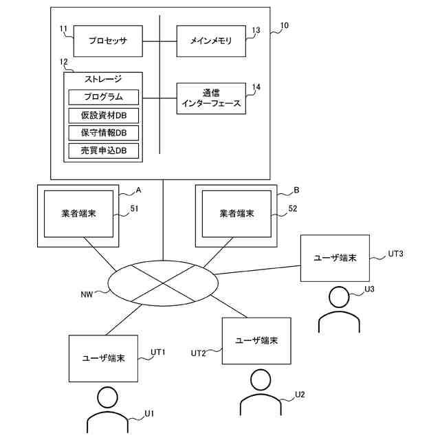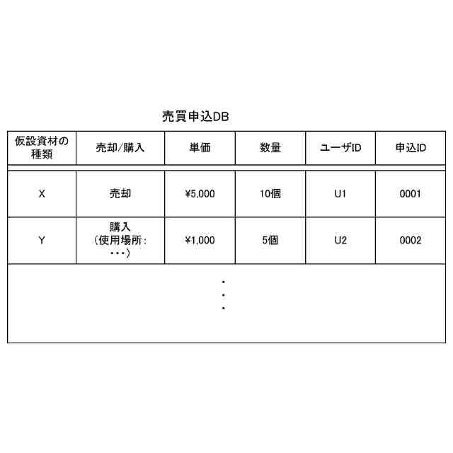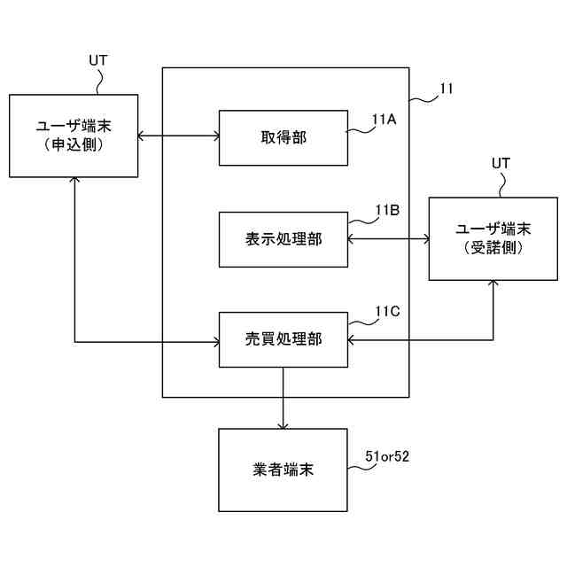 取得部11Aが、第1のユーザUが使用する第1のユーザ端末UTに入力された、仮設資材の売買の申込内容を取得する。売買は、購入又は売却のいずれかである。さらに、表示処理部11Bが、取得部11Aで取得された前記売買の前記申込内容を第2のユーザUが使用する第2のユーザ端末UTに表示する表示処理を行う。売買処理部11Cは、第2のユーザ端末UTに入力された、第2のユーザUが前記申込内容を受諾する旨の情報である受諾情報に基づいて前記売買を成立させる売買処理を行う。