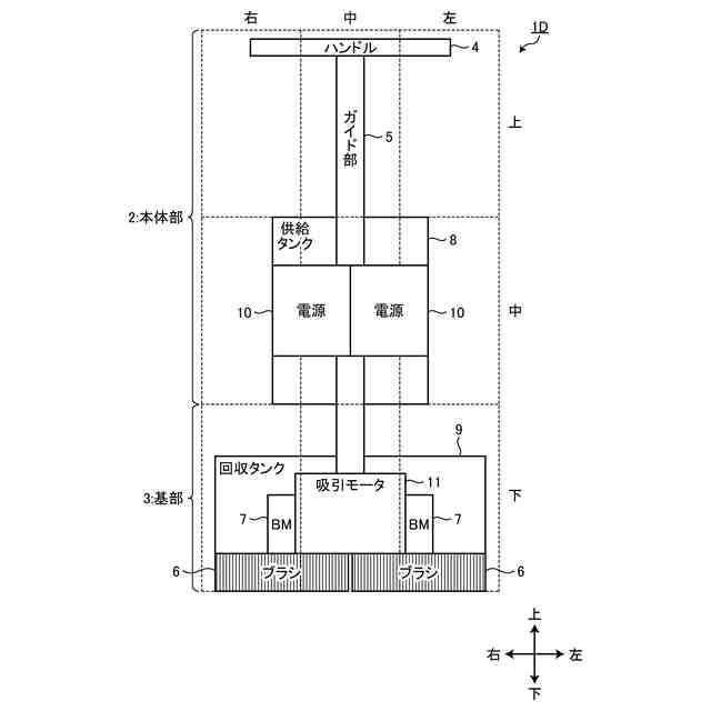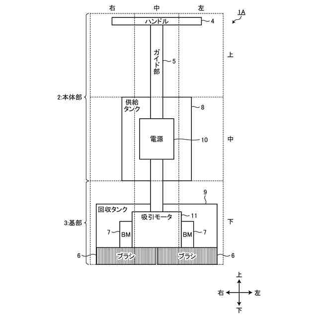 床洗浄機の一種として、スクラバードライヤーが知られている。特許文献1には、スクラバードライヤーに係る技術が開示されている。特許文献1において、スクラバードライヤーは、ブラッシング手段が設けられるベース本体と、ベース本体よりも上方に配置されベース本体に連結される操舵手段と、洗浄液が収容される第2のタンクと、汚れを吸引する吸引手段と、汚れが収容される第1のタンクとを備える。第2のタンク及び第1のタンクは、ベース本体に配置される。