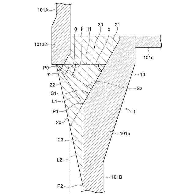 前記複数の支持壁のうち一の支持壁を含む鉛直断面において、前記予備室の下端部と前記一の支持壁の内周面とが交差する第3の交差部を含む水平面と、前記第2の交差部及び前記第3の交差部を通る仮想直線とがなす角度θは、70°以下である、請求項3に記載のスローピングフリュー部構造。