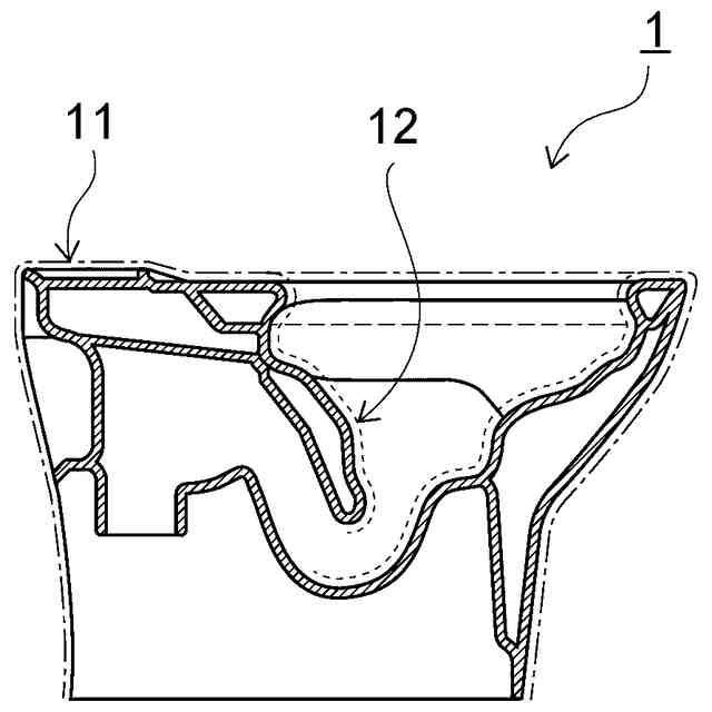 本発明による、防汚性の釉薬層とマット調釉薬層とを設けた水洗大便器の概念図であり、破線11で示す表面にマット調釉薬層を付し、汚物受け面12に点線12で示す防汚性釉薬層を設ける。