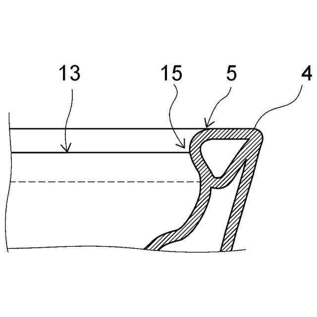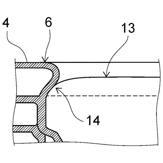 リム部4において、線13を境界にして、破線11で示すマット調釉薬層が設けられ、汚物受け面12側に点線12で示す防汚性釉薬層を設けられることを示す図である。