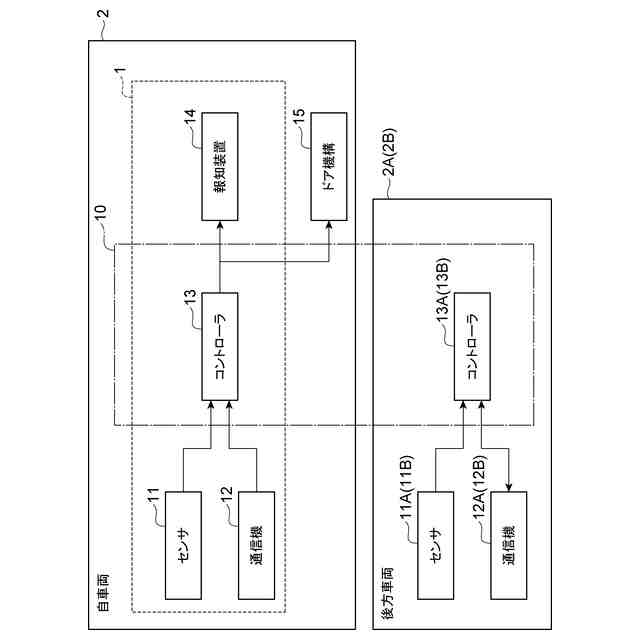 図1は、一実施形態に係る降車支援装置が備わる自車両の構成と、他車両の構成との一例を示すブロック図である。図1に示されるように、降車支援装置1は、一例として自車両2(車両、第一車両の一例)に搭載される。自車両2は、ドライバによって運転される車両であってもよいし、自動運転車両であってもよい。