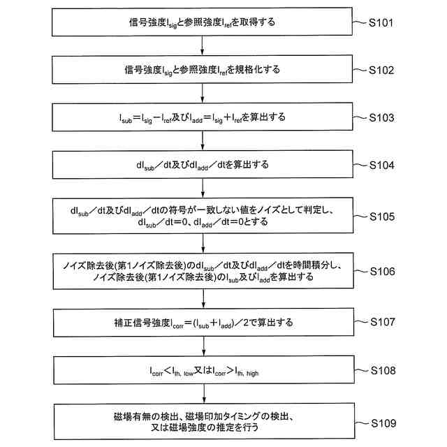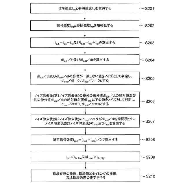 本発明に係るダイヤモンド量子センサのノイズ除去方法において、前記第1ノイズ除去ステップと前記積分ステップとの間に、第1ノイズ除去後の前記差分の微分値及び前記和の微分値に対し、前記差分の微分値の絶対値及び前記和の微分値の絶対値をそれぞれ求め、求められた前記差分の微分値の絶対値及び前記和の微分値の絶対値が予め設定した閾値以下の値をノイズとして判定し、ノイズとして判定された前記差分の微分値及び前記和の微分値をそれぞれゼロとする第2ノイズ除去ステップを更に含むことが好適である。このようにすれば、微小な強度変化をノイズとして除去することができる。