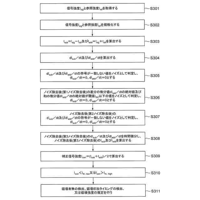 取得された前記信号強度及び前記参照強度に対し、時間ごとに、前記信号強度と前記参照強度との差分及び前記信号強度と前記参照強度との和をそれぞれ算出する算出ステップと、