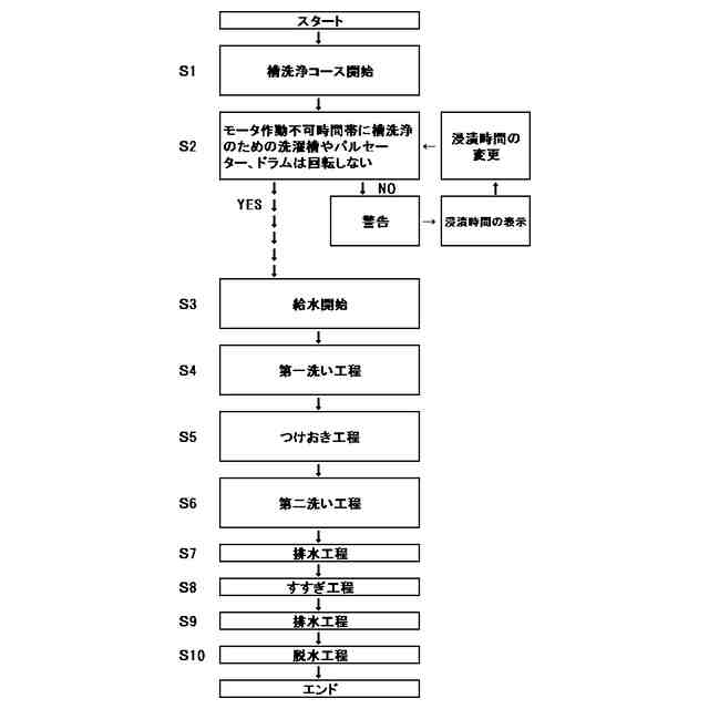 【解決手段】時計を内蔵し、使用者が予めモータを作動させることのできない時間帯を設定することのできる手段を備え、槽洗浄の自動運転において、つけおき終了後の槽本洗い開始時刻が上記時間帯に入る場合、使用者に警告する洗濯機を提供する。