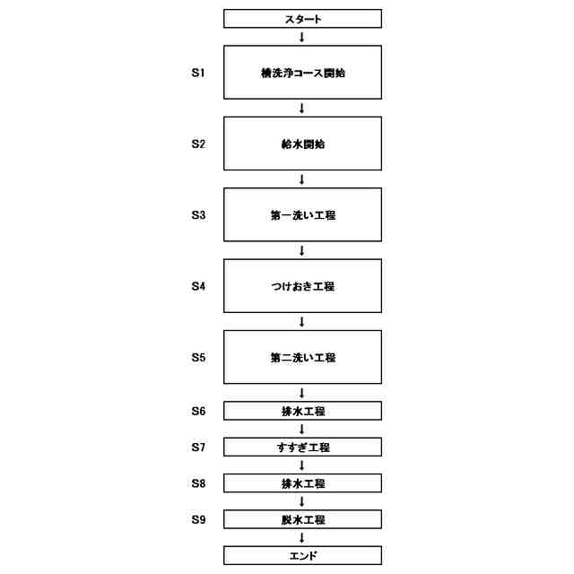 図7の通り、第一洗い工程の後、つけおき工程となり、その後、第二洗い工程に進む。
