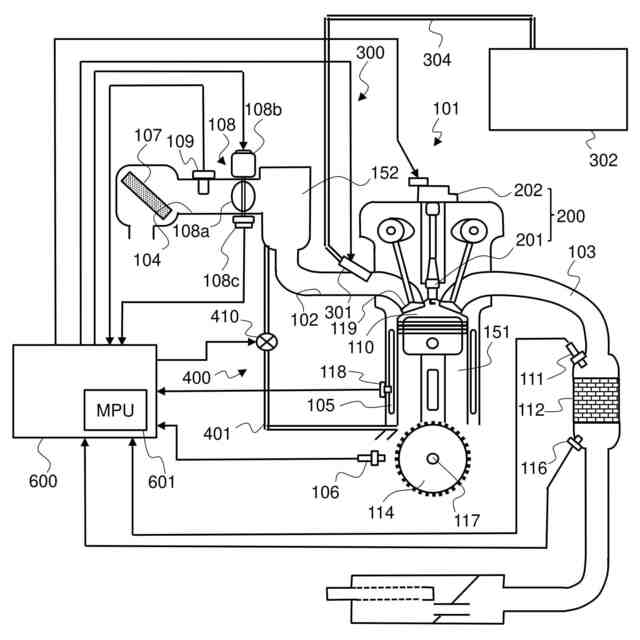 内燃機関101は、点火装置200、燃料噴射装置300、電子制御式スロットル108、排気浄化触媒112を備える。