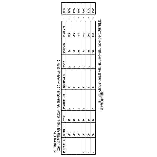 取引先、品目、1又は複数の寸法、当該1又は複数の寸法の適用範囲、売上単価を関連付けて登録した売上単価マスタと、