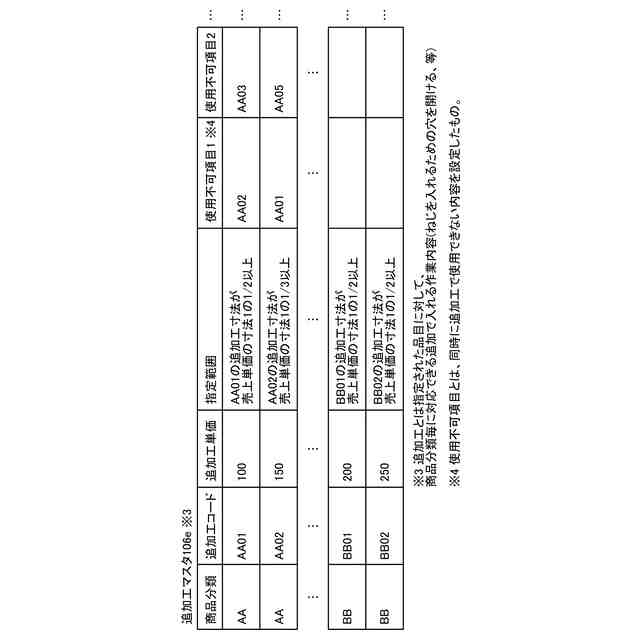 追加工、追加工単価、当該追加工について加工可能な範囲である指定範囲、当該追加工に対して使用できない追加工である使用不可項目を関連付けて登録した追加工マスタにアクセス可能に構成されており、
