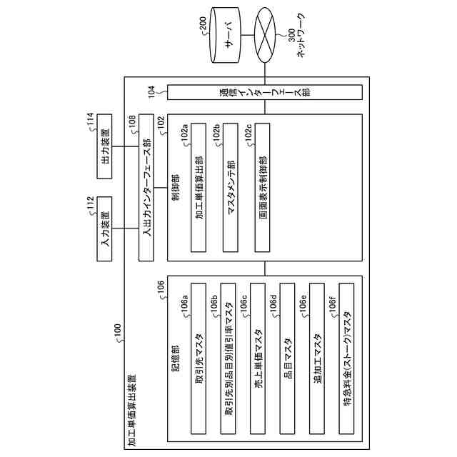また、本発明の一態様によれば、前記制御部は、更に、取引先、取引先別値引率を関連付けて登録した取引先マスタと、取引先、品目、値引率を関連付けて登録した取引先別品目別値引率マスタと、取引先、品目、1又は複数の寸法、当該1又は複数の寸法の適用範囲、単価を関連付けて登録した売上単価マスタと、品目、数量の適用範囲、数量別値引率を関連付けて登録した品目マスタと、にアクセス可能に構成されており、前記単価計算の処理では、前記売上単価マスタから、指定される取引先、品目、品目の寸法をキーとして、単価を取得し、前記取引先マスタから、指定される取引先をキーとして、取引先別値引率を取得し、前記取引先別品目別値引率マスタから、指定される取引先及び品目をキーとして、取引先別品目別値引率を取得し、前記品目マスタから、指定される品目及び数量をキーとして、数量別値引率を取得し、売上単価を、売上単価=取得した単価×取得した取引先別値引率×取得した取引先別品目別値引率×取得した数量別値引率で算出することにしてもよい。