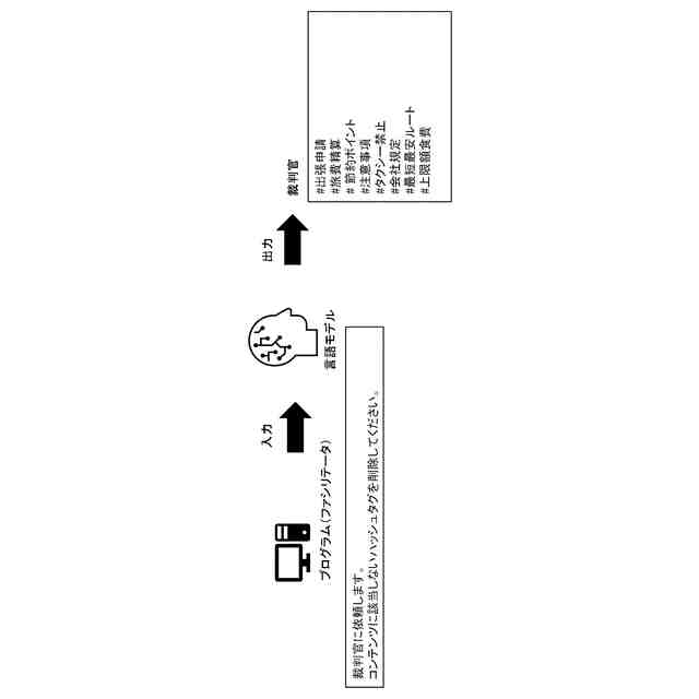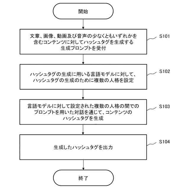 本開示の一態様におけるプログラムは、文章、画像、動画及び音声の少なくともいずれかを含むコンテンツに対してハッシュタグを生成する生成プロンプトを受付し、ハッシュタグの生成に用いる言語モデルに対して、ハッシュタグの生成のために複数の人格を設定し、言語モデルに対して設定された複数の人格の間でのプロンプトを用いた対話を通じて、コンテンツのハッシュタグを生成し、生成したハッシュタグを出力させる、ことをコンピュータに実行させる。