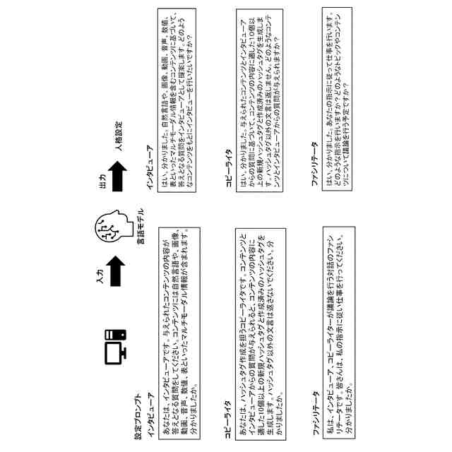 前記言語モデルに対して設定された複数の人格の間でのプロンプトを用いた対話を通じて、前記コンテンツのハッシュタグを生成し、