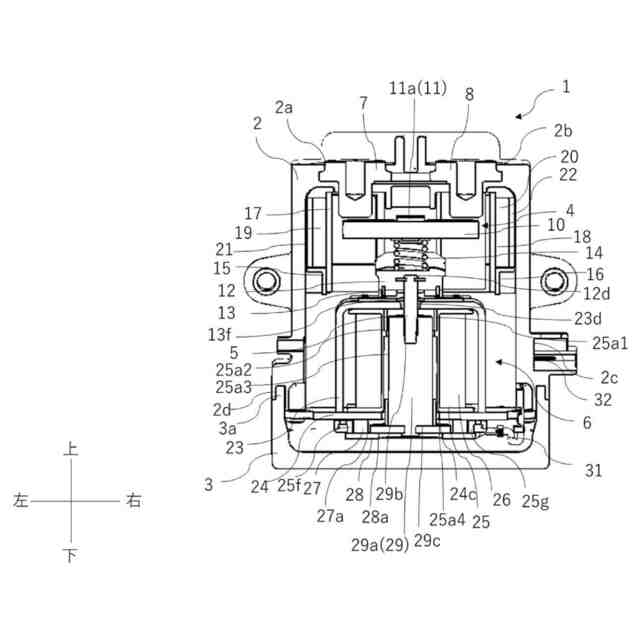 以下、図1~図7に基づいて本発明の実施形態を説明する。以下の説明において、同一又は類似の部分には、同一又は類似の符号を付している。また、上下、左右、前後の各方向は、図2における上下、左右、前後の各方向を意味するものとする。上下方向とは、固定接点及び可動接点が接離する方向である。左右方向とは、2つの可動接点が並設されている方向である。前後方向とは、上下方向及び左右方向と直交する方向である。ただし、これらの方向は、説明の便宜上定義されるものであって、電磁接触器の配置方向を限定するものではない。