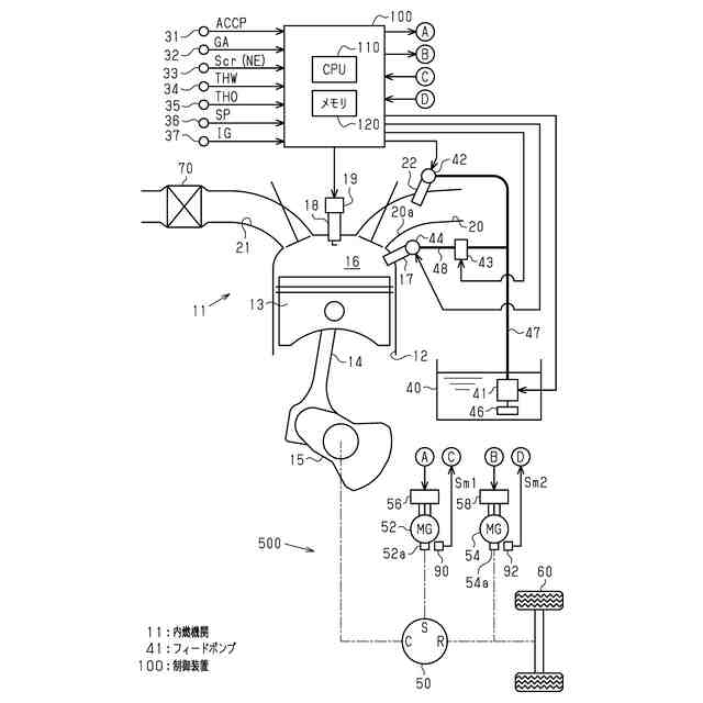 図1に示すように、車両500は内燃機関11を搭載している。内燃機関11の気筒12内にはピストン13が備えられている。ピストン13は、内燃機関11の出力軸であるクランクシャフト15にコネクティングロッド14を介して連結されており、コネクティングロッド14によりピストン13の往復運動がクランクシャフト15の回転運動に変換される。