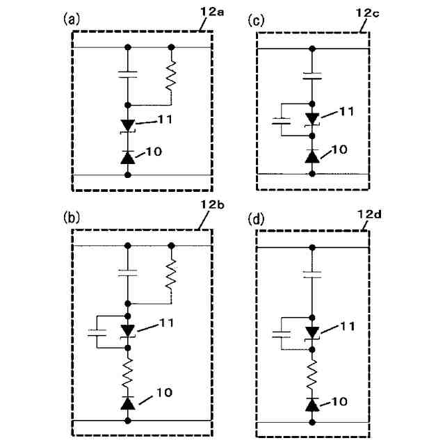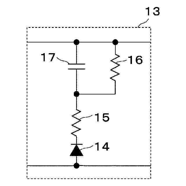 このようにいろいろな応用例が開示されているが、最も基本的なDCRスナバ回路図9は、13に示すような、整流用ダイオードを用いたスナバ用ダイオード14と、スナバ用ダイオード14のカソードに一端が接続された抵抗15と、抵抗15の他端に互いに並列に接続された抵抗16及びコンデンサ17と、を有する構成である。