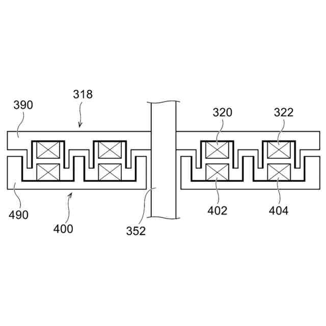 基板上に既に形成されている回路素子の破損、受電コイルの下方にある電気デバイスへの悪影響を防止するため、受電コイルの上および給電コイルの下に電磁シールドとしてのフェライトプレートが設けられている。径方向に隣接するコイル間における電磁気的な相互干渉を防止するために、径方向に隣接するコイル間にフェライトリングが設けられている。