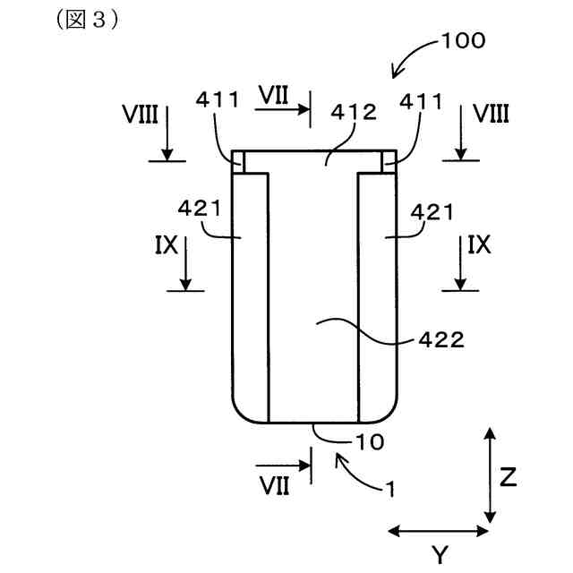 前記立設方向に垂直な断面において、前記収容部の隅部は円弧状をなしているとともに、前記蓋嵌入部の隅部は前記収容部の隅部よりも曲率半径の小さい円弧状をなしており、
