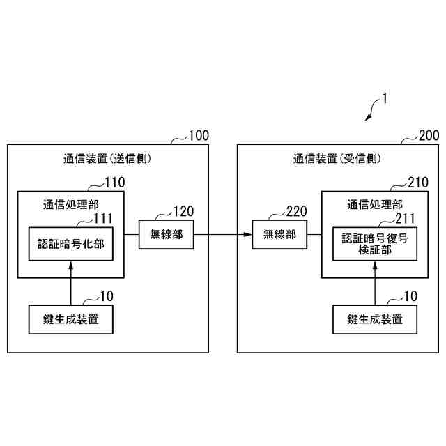 【解決手段】通信装置は、認証暗号に用いられる鍵を生成する鍵生成装置と、認証暗号を用いてメッセージの暗号化及びメッセージ認証に関する処理を実行する通信処理部とを備える。