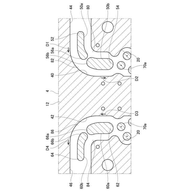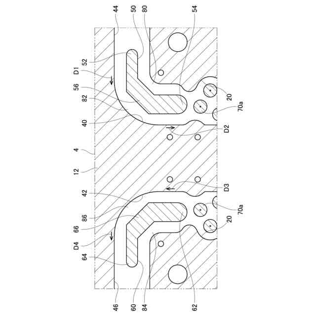 第3の態様では、上記第1又は第2の態様において、冷却器が、前記冷却流路から導出される冷媒が流れる導出流路と、前記冷却流路と前記導出流路を繋ぐ湾曲状の第2整流流路と、前記第2整流流路内に配置され、前記冷却流路から前記導出流路へ流れる冷媒を案内する1又は複数の第2整流板と、を備えていてもよい。