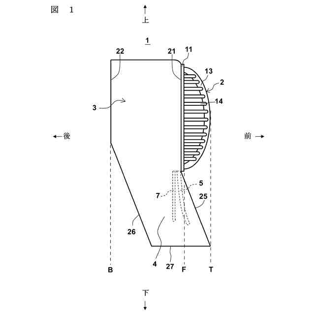 前記の目的を達成するためになされた、特許請求の範囲の請求項1に記載された武道用面は、環状の台輪に縦金及び複数の横金が架け渡されている面金と、前記面金の下部を除く周縁部に取り付けられた面布団と、前記面金の下部に取り付けられた突き垂とを備え、前記面布団の長手方向の端部側が前記面金から下方に垂れて面垂を構成している武道用面であって、前記面垂を真下に垂らした状態で前記面金を真横から見たときに、前記面垂の前縁が、前記台輪の前部の延長線よりも少なくとも一部で前方側に出ている形状に形成されていることを特徴とする。