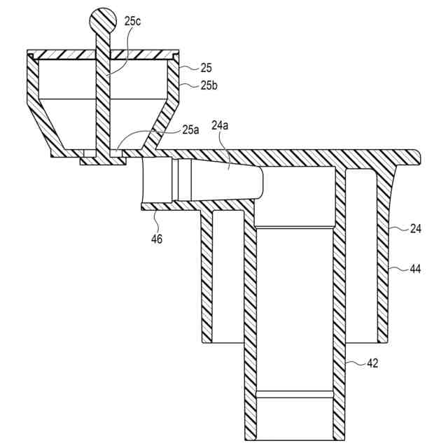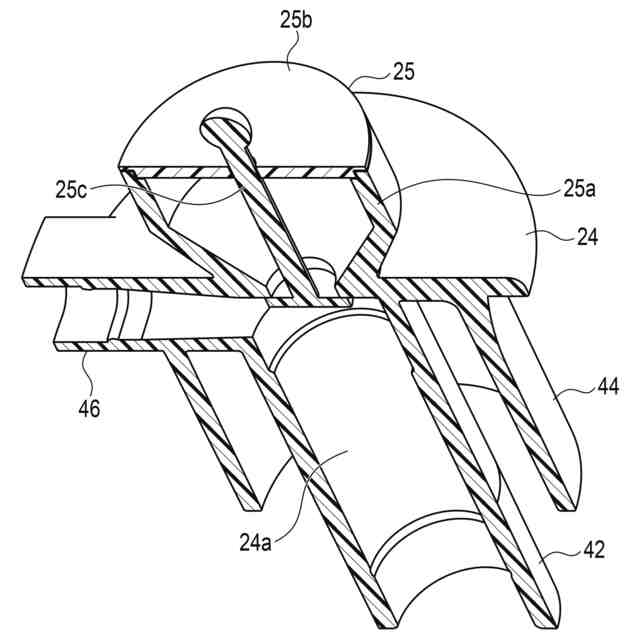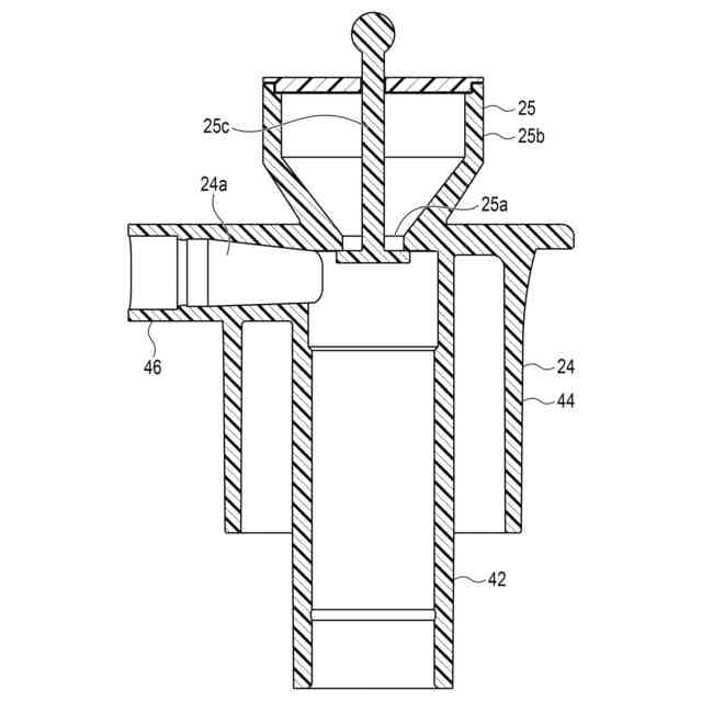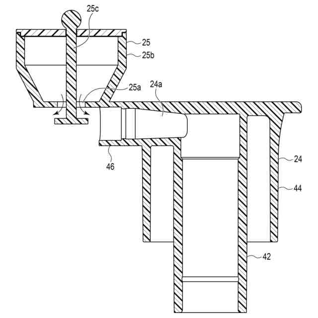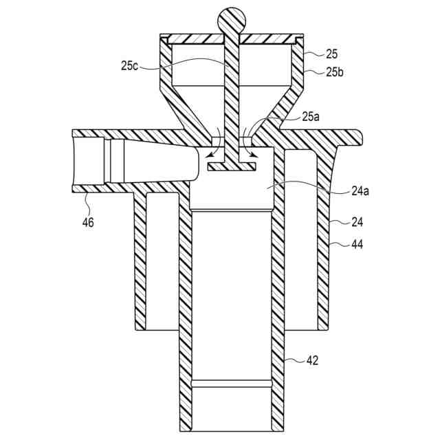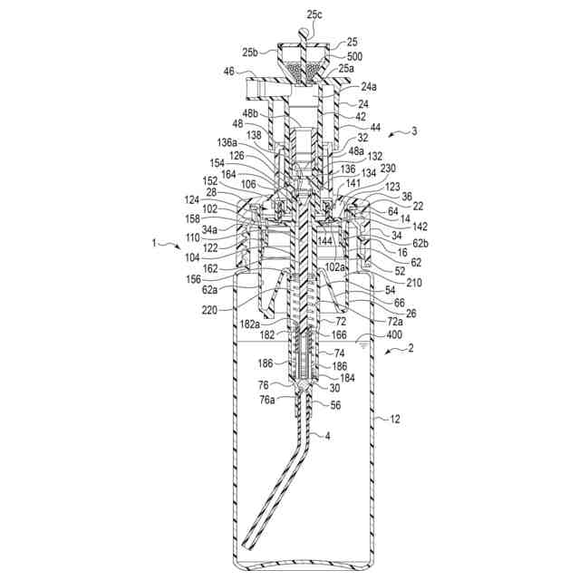図1は一実施形態に係る吐出容器1の構成を示す断面図である。本実施形態において、上下方向は、図1に示すように、吐出容器1の容器2側を下方、ポンプ体3のノズル24側を上方とする。図2は、吐出容器1のノズル24及び供給装置25の構成を示す斜視図、図3は、ノズル24及び供給装置25の構成を示す断面図、図4は、ノズル24及び供給装置25の構成を示す断面図である。また、図5は、他の実施形態に係る吐出容器1のノズル24及び供給装置25の構成を示す斜視図、図6は、ノズル24及び供給装置25の構成を示す断面図、図7は、ノズル24及び供給装置25の構成を示す断面図である。