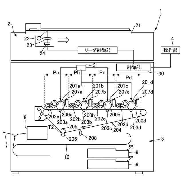 本実施形態について説明する。まず、本実施形態の定着装置を用いて好適な画像形成装置の概略構成について、図1を用いて説明する。画像形成装置1は、イエロー、マゼンタ、シアン、ブラックの4色に対応して設けられた4つの画像形成部Pa、Pb、Pc、Pdを有する電子写真方式のフルカラープリンタである。本実施形態は、画像形成部Pa、Pb、Pc、Pdを中間転写ベルト204の回転方向に沿って配置したタンデム型の画像形成装置1である。画像形成装置1は、画像形成装置1の装置本体3(筐体)に接続された原稿読取装置2又は装置本体3に対し通信可能に接続されたプリントサーバ等の外部ホスト機器からの画像信号に応じて、トナー像を記録材に形成する。記録材としては、用紙、プラスチックフィルム、布などのシート材が挙げられる。