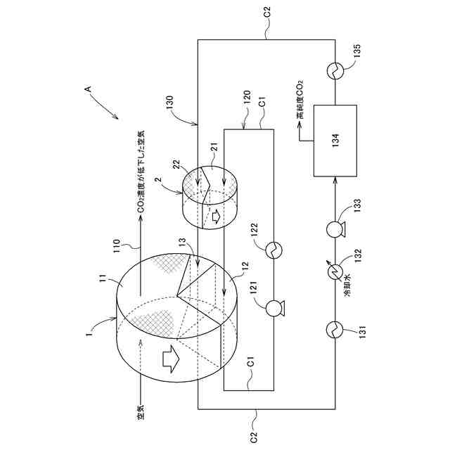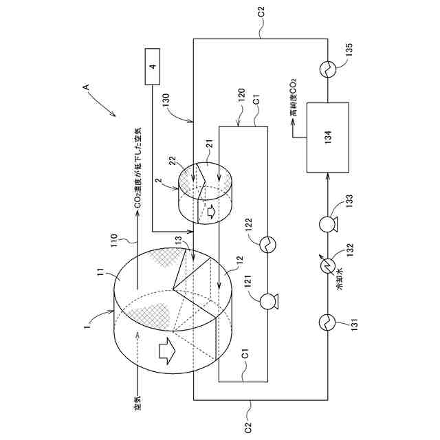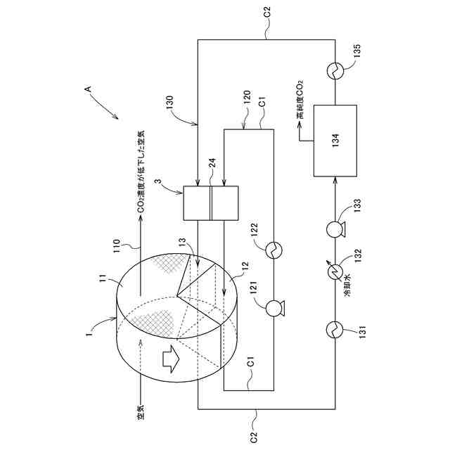 ハニカム状の担体を円盤状のハニカムローターとして形成し、その回転により吸着部と再生部を繰り返し移動するように構成し、連続的に大気に含まれる二酸化炭素の吸着と、再生用ガスによる再生を行うことができる二酸化炭素の濃縮装置も知られている(特許文献1~3)。