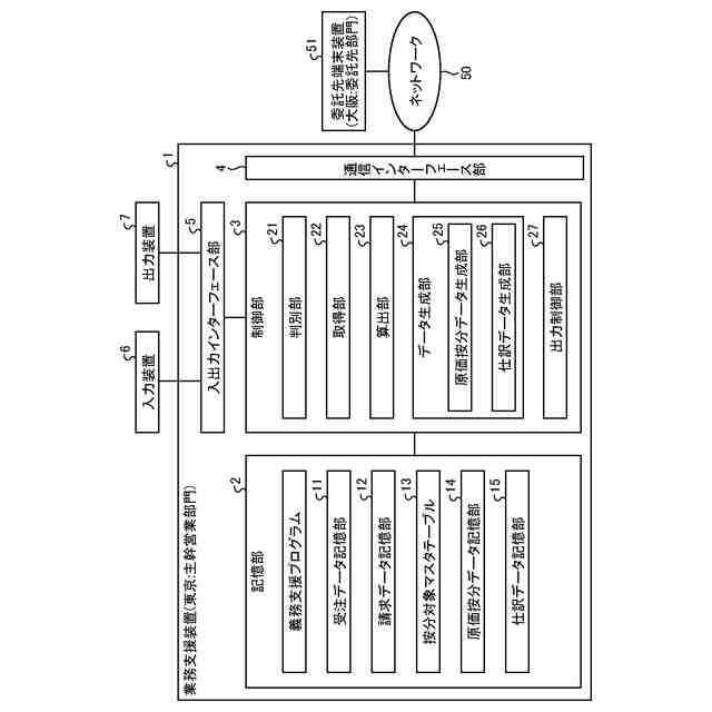 また、上述の課題を解決し、目的を達成するために、本発明に係る業務支援方法は、受注部門で受注したプロジェクトを、一つ又は複数の他の部門と共に共同して作業した際に、各部門の作業の割合に応じた原価の按分業務の支援を図るための業務支援方法であって、判別部が、受注部門及び他の部門の、請求項目、請求金額及び計上部門を含む請求データのうち、他の部門の請求データの請求項目が、原価の按分対象となる請求項目、原価項目及び按分手数料率がそれぞれ関連付けされて記憶された按分対象マスタテーブルに記憶されているか否かに基づいて、他の部門の請求データに対応する原価按分データの生成の要否を判別する判別ステップと、取得部が、他の部門の請求データに含まれる請求項目が按分対象マスタテーブルに記憶されており、他の部門の請求データが原価按分データの生成対象となる請求データであるとの判別結果が得られた場合、他の部門の請求データの請求項目に対応する原価項目及び按分手数料率を按分対象マスタテーブルから取得する取得ステップと、算出部が、原価按分データの生成対象となる他の部門の請求データの請求金額に、按分対象マスタテーブルから取得された按分手数料率を乗算処理した原価金額を算出する算出ステップと、原価按分データ生成部が、算出ステップで算出された原価金額、原価項目及び計上部門を含む他の部門の原価按分データを生成すると共に、生成した他の部門の原価按分データの原価金額をマイナスの金額とした原価金額、生成した他の部門の原価按分データに含まれる原価項目と同じ原価項目を含む、受注部門の原価按分データを生成する原価按分データ生成ステップと、出力制御部が、原価按分データ生成ステップで生成された原価按分データを出力装置に出力する出力制御ステップと、を有する。