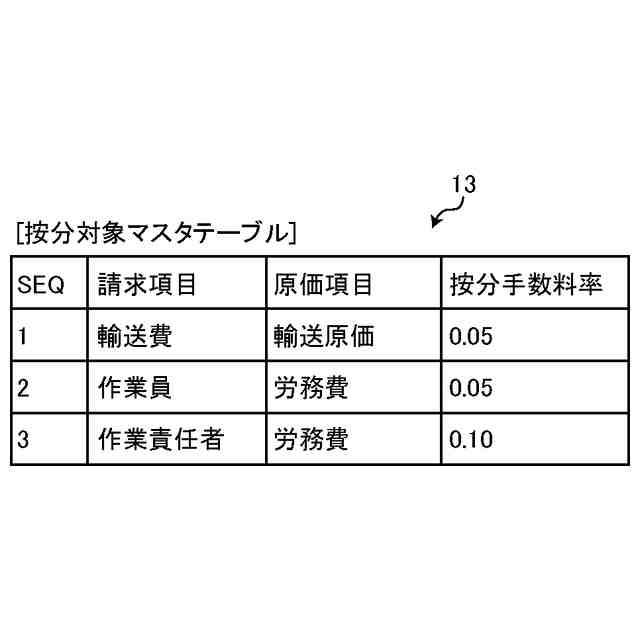 前記他の部門の前記請求データに含まれる前記請求項目が前記按分対象マスタテーブルに記憶されており、当該他の部門の前記請求データが前記原価按分データの生成対象となる請求データであるとの判別結果が得られた場合、前記他の部門の前記請求データの前記請求項目に対応する前記原価項目及び前記按分手数料率を前記按分対象マスタテーブルから取得する取得部と、