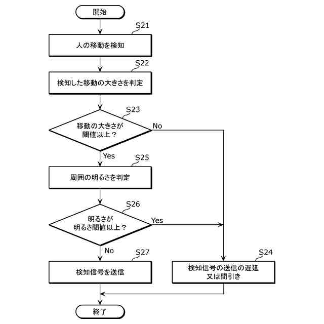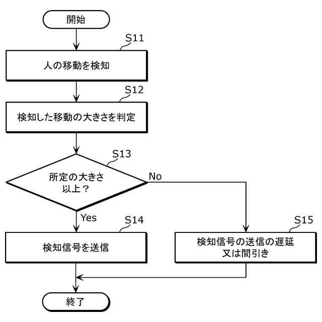 前記制御部は、前記人検知部が検知した人の移動の大きさが前記所定の大きさ以上であり、前記明るさ検知部が検知した明るさが明るさ閾値以上であると判定した場合に、前記通信部による前記検知信号の送信の遅延または間引きをする、