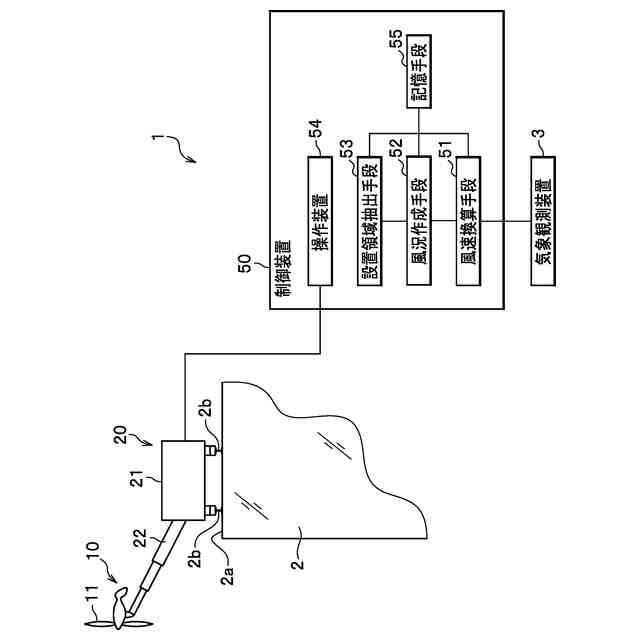 また、風力発電装置の退避領域とは、例えば、風況作成段階において弱風となることが推定された領域や、格納庫内の領域や屋上の設備が風除けとなって風速が小さくなる領域などである。