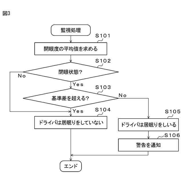 監視装置は、ドライバの顔の画像に基づいて開眼度を調べて、居眠りしているかを判定する。監視装置は、開眼度の低い状態(目を閉じた状態)が所定の時間継続して検出された場合、ドライバは居眠りしていると判定して、警告をドライバへ通知する。