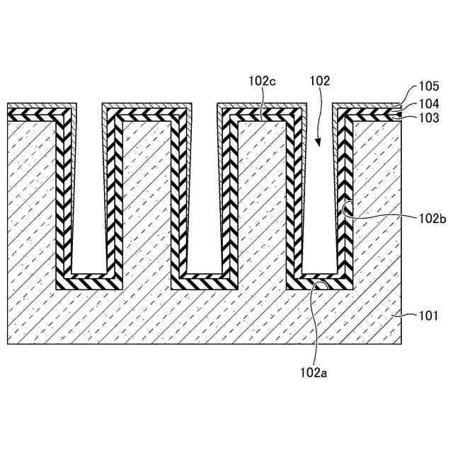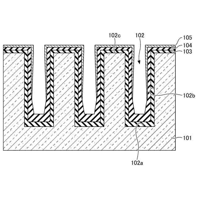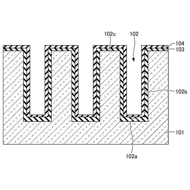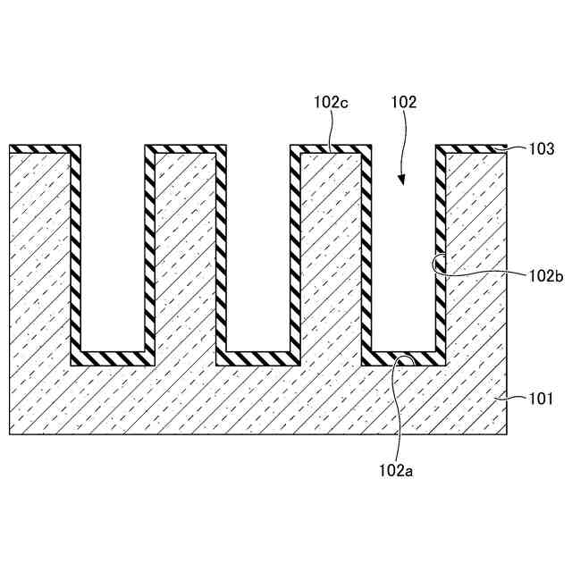 まず、図1に示されるように、基板101を準備する。基板101は、例えばシリコン基板等の半導体基板である。基板101は、表面に凹部102を有する。凹部102は、底面102aと、内側面102bと、上面102cとを含む。凹部102は、例えばトレンチである。凹部102は、ホールであってもよい。基板101の表面には、絶縁膜103が設けられてもよい。絶縁膜103は、底面102aと、内側面102bと、上面102cとを覆う。絶縁膜103は、例えばシリコン酸化膜である。