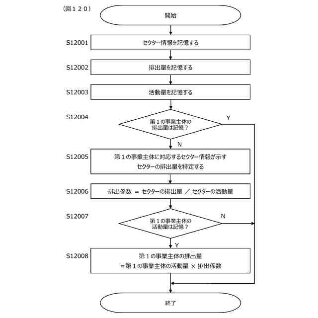 第1の事業主体の前記排出量が記憶されていない場合、前記第1の事業主体に対応する前記セクター情報が示す前記セクターの前記排出量を特定するステップと、