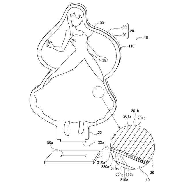 アクリルスタンドと呼ばれるフィギュアにおいて、印象に残るものとしては、例えば、特開2023-26049号公報において、「発光部を備えた台座に固定され、該発光部からの光により図柄が照明されるライティングアクリルスタンドであって、前記図柄が第1の裏面に印刷された第1のアクリル板と、前記発光部からの光を反射させるための塗料が第2の裏面の少なくとも一部に印刷された第2のアクリル板と、を有し、前記第1のアクリル板は、前記台座へ挿入可能な第1の突出部を有し、前記第2のアクリル板は、前記台座へ挿入可能な第2の突出部を有し、前記第1の突出部の前記台座への挿入方向の長さは、前記第2の突出部の前記挿入方向の長さよりも短く、前記第1のアクリル板の前記第1の裏面と前記第2のアクリル板の表面とを対向させた状態で、前記第1の突出部と前記第2の突出部との少なくとも一部を重ね合わせて前記台座の凹部へ挿入することにより、前記第1のアクリル板と前記第2のアクリル板は前記台座に固定されるように構成されており、前記第1のアクリル板の前記第1の裏面における前記第1の突出部の少なくとも一部には、遮光塗料が印刷されており、前記第1の突出部の先端には、複数の凹凸形状が形成されていることを特徴とするライティングアクリルスタンド。」というものが開示されている。