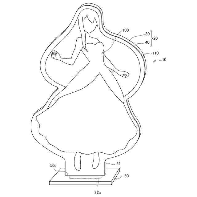 近頃、イベント時に提示したり、飾って楽しんだりするいわゆるアクリルスタンドと呼ばれるフィギュアが流行している。このフィギュアは、台に取り外し可能にとりつけることができるものであり、そのフィギュアは、アニメーションやゲームのキャラクタを絵柄として表示したものであり、絵柄のみならずその全体の形状も、そのキャラクタの輪郭をくりぬくように構成されている。