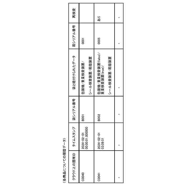 従来から、箱詰装置によって箱詰される商品と箱とを紐付けて記憶するトレーサビリティ管理装置が知られている。かかるトレーサビリティ管理装置では、包装工程から箱詰工程までの間に重量検査やシール検査等の工程があり、それらの工程で検査された結果が各商品についての履歴データとして時系列で記憶されるようになっている。