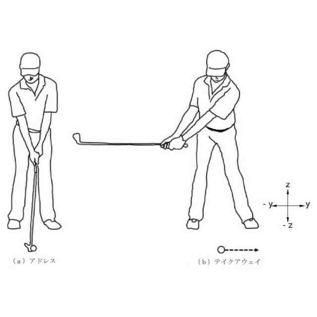 また、図2(b)の場合は、背面(側面)から使用者を眺めたときの様子であって、クラブシャフトが地面と水平をなしているものの、ターゲットと平行をなす場合を好適な姿勢とし、グリップ部分を基準としてヘッドがターゲットの外を向く場合(outside takeaway)と、ヘッドが内側を向く場合(inside takeaway)とがある。